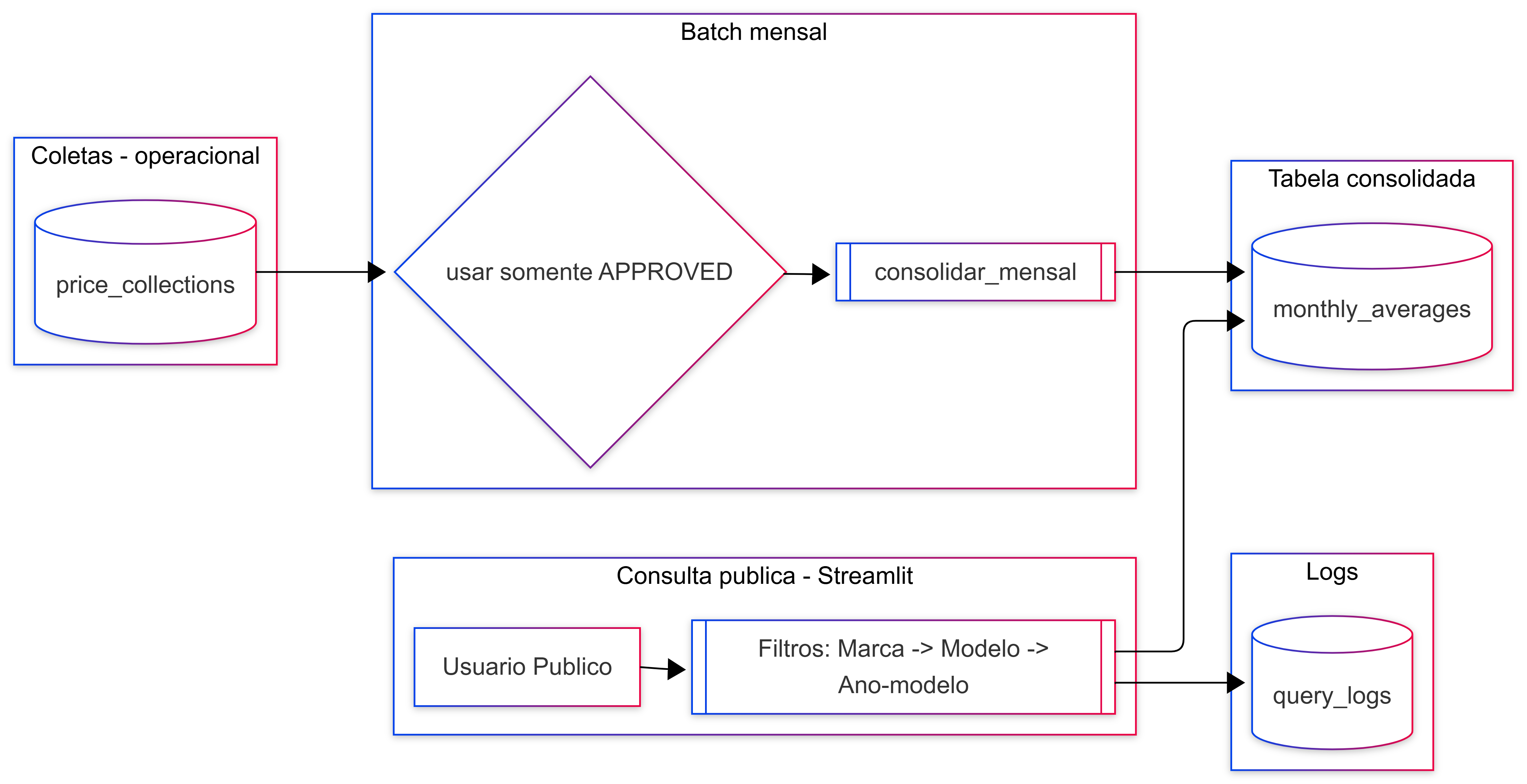price_collections), a consolidação mensal no batch (somenteAPPROVED), a tabela consolidada (monthly_averages) e o registro de auditoria de consultas (query_logs).