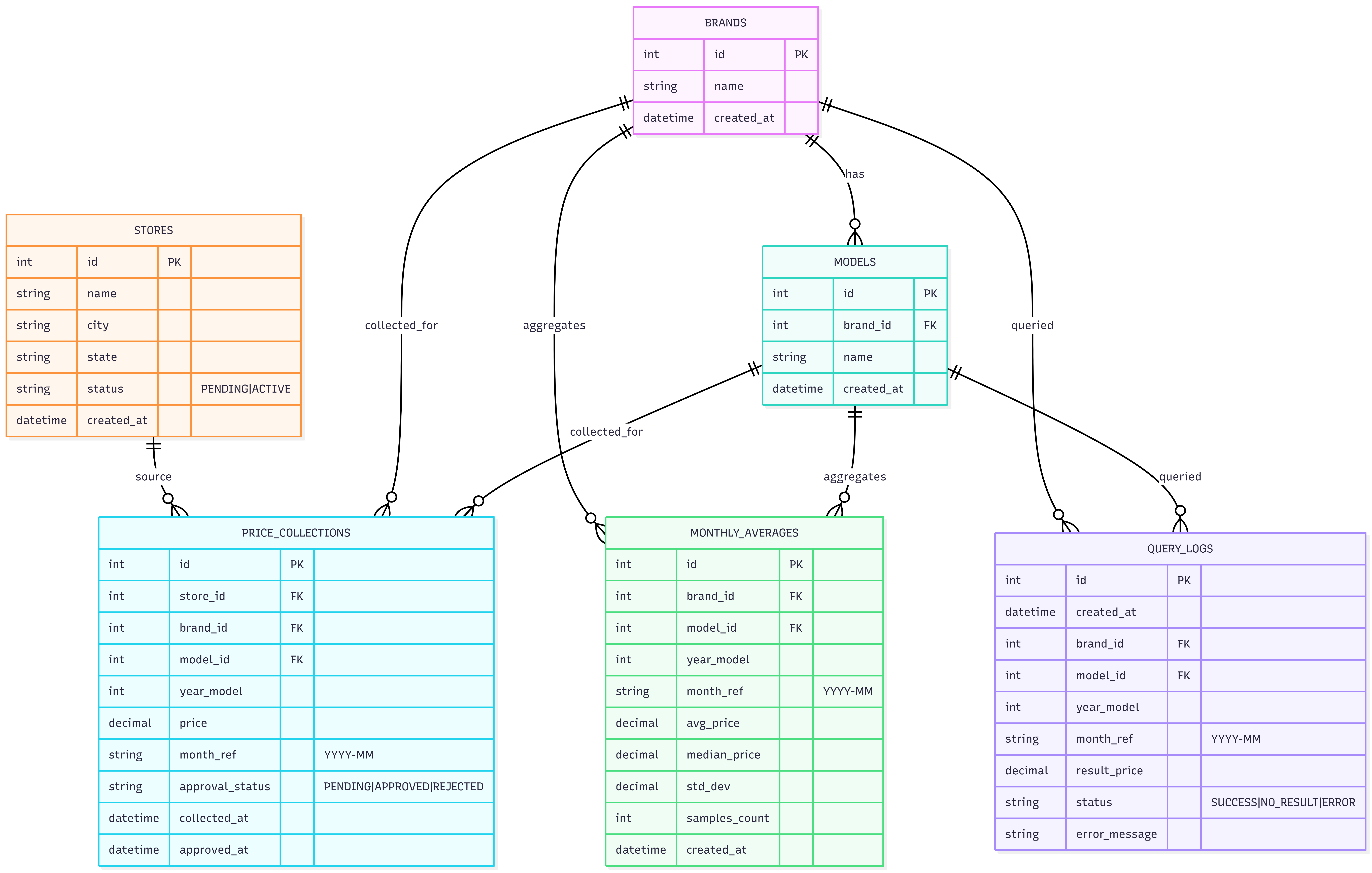 models.brand_id→brands.idprice_collections.store_id→stores.idprice_collections.brand_id→brands.idprice_collections.model_id→models.idmonthly_averages.brand_id→brands.idmonthly_averages.model_id→models.idquery_logs.brand_id→brands.id(nullable)query_logs.model_id→models.id(nullable)