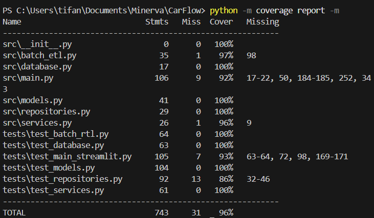 A garantia de qualidade do CarFlow baseia-se em três pilares: Análise Estática, Testes Automatizados com alta cobertura e Integração Contínua (CI). O objetivo é garantir que as regras de negócio e o processamento de dados (ETL) permaneçam estáveis a cada evolução.