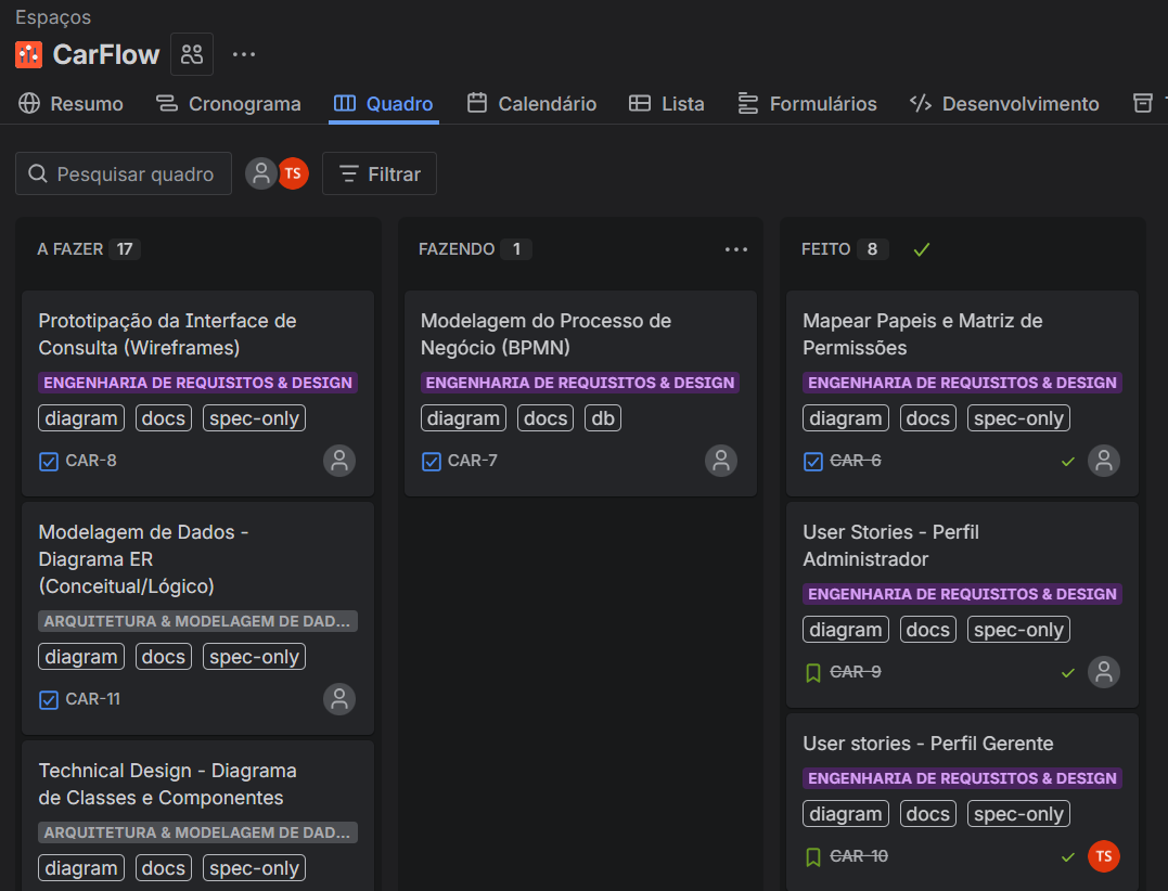 Esta seção documenta como o projeto CarFlow foi planejado e organizado no Jira, incluindo: - estrutura de épicos (macro-entregas), - padrão de issues (histórias e tarefas), - uso de labels (build vs spec-only), - workflow (A fazer → Em progresso → Feito), - definição de pronto (DoD) e rastreabilidade com a documentação.